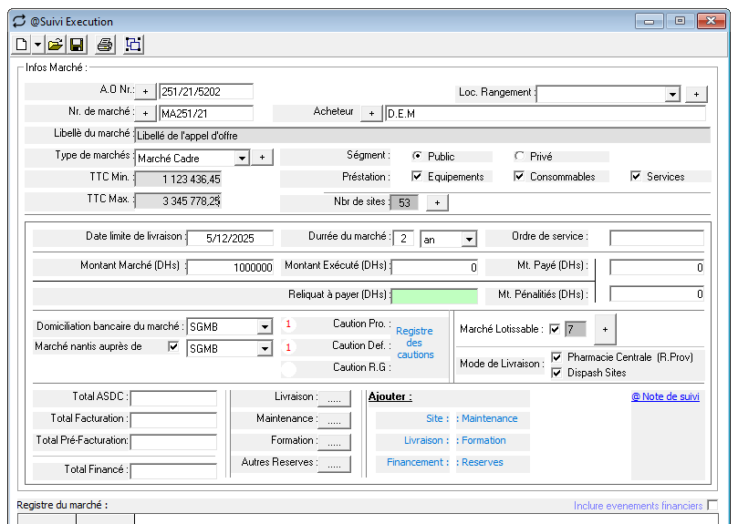 - "Éparpillement" des données : Les informations sur les marchés (contrats, avenants, cautions, la mobilisation pour financement, échéances) sont dispersées dans des dossiers papier, des emails et des fichiers Excel non synchronisés.